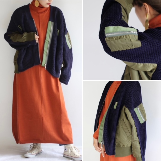 MA-1 コンビニット💕¥9790 MA-1のデザインとニットをドッキングしたお洒落なニットブルゾンが入荷しました💕 一枚羽織るだけでお洒落が決まる😍 とっても軽くて着やすいです ネイビー❎カーキのカラーがスタイリッシュな一着です アクリル50% ポリエステル36% レーヨン14% 着丈 60cm 身幅 150cm 裄丈 84cm 裾幅 71cm 2021年11月30日