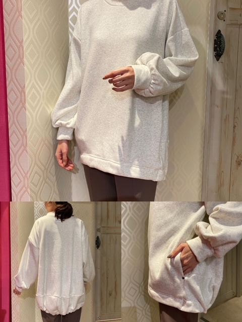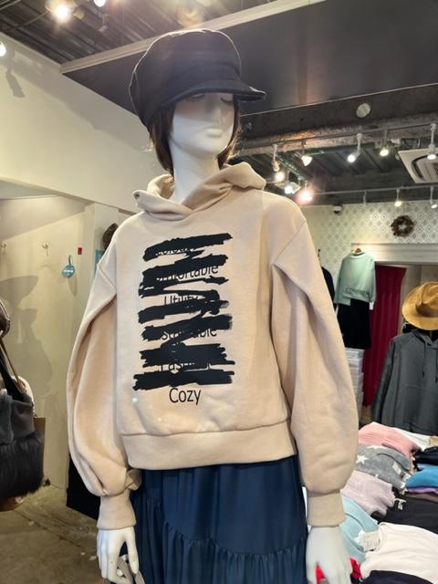 デザインフードトップス💕 胸元のプリントとお袖のタックが素敵なフード付きの裏毛トップスが入荷しております💕 比較的ショートの着丈で、スカートやワイドパンツと好相性💕 小柄さんでもスッキリとしたシルエットが実現します🎉 クールな大人カジュアルを楽しみたい方にお薦めのアイテムです 展示会オーダー 一点のみの入荷となっております 2021年11月3日