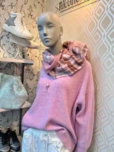 ピンクのニットと白のデニム💕 ピンク❎ホワイトには、アクセントになるチェックのストールでポイントを💕 めちゃキュートな配色ですが、ワイドデニムのカジュアルなパンツコーデにすることで、甘さを軽減💕 ラグジュアリーなカシミアのストールで大人コーデの完成です💕 ニット ¥15180 パンツ ¥15180 ストール ¥12100 カシミア100% 星のスニーカー ¥10890 2021年11月12日