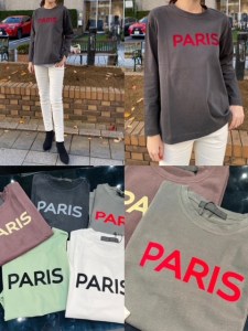 トップス¥9350 パンツ¥14080✨ しっかりしたコットン生地で、洗ってもヨレ無い上質なロンT💕 冬から春までのインナーとしてヘビロテ出来そうです。 PARISのロゴが程よいアクセント✨ 着丈は腰丈なので、バランスがとりやすいです😊 白はもちろん、ブラウンに赤い文字やカーキにグリーンのカラーもお洒落ですよ✨ トップス¥9350 パンツ¥14080 2021年11月19日