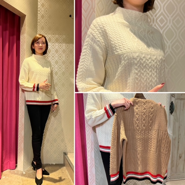 トリコロールラインのケーブルニット 裾とお袖のトリコロールラインがフレンチシックなケーブルデザインニットが到着しました 肌触りの良さが魅力のニットです。 ふんわりスカート&スニーカーで合わせても素敵!! オフホワイトとキャメルの2カラーで入荷しております モデル168cm ニット ¥15180 デニム ¥12980 2021年12月2日