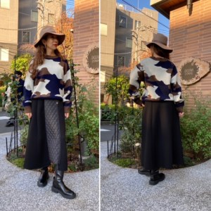 迷彩ニット❎デザインスカート 茶系の迷彩がお洒落なデザインニット💕とキルティング配色のボンディングスカートのコーデはいかがでしょうか? スカートは総ゴム仕様で、履き心地快適なスカートですよん💕 とっても軽くて着心地の良いコーデです💕 ニット ¥10780 スカート ¥10780 2021年12月4日