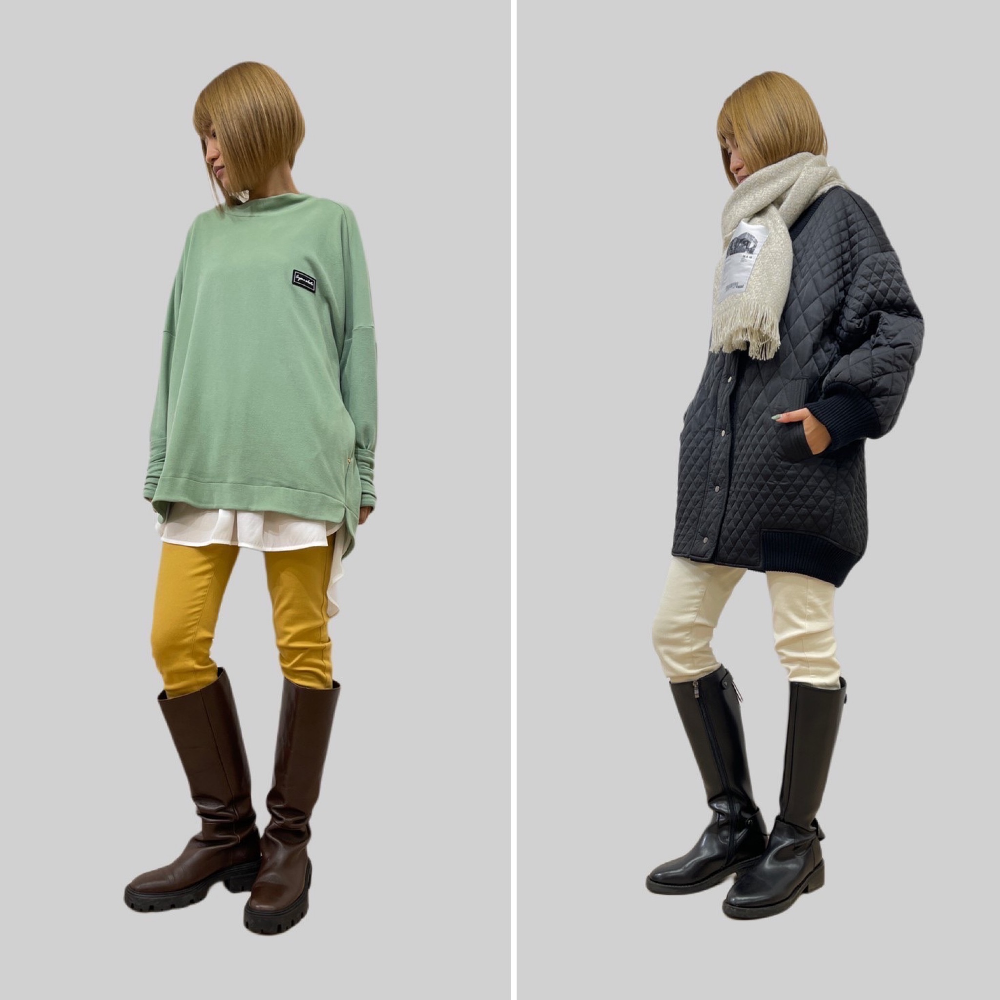 カラー暖パンのコーデ💕 新作カラーの暖パンが入荷しました💕 個性的なイエローやパープル、定番のエクリュなどです レーヨン混紡のストレッチ素材でめちゃ履き心地が良いです 暖かトップスやコートコーデに合わせてぜひいかがでしょうか? 左側のトップスは、エクリュ、チャコールグレー、グリーン、ブラックで入荷いたしました💕 ヒップが隠れる絶妙な着丈もお薦めのポイント トップスグリーン ¥11880 パンツ ¥14080 ストール ¥7590 2021年12月5日