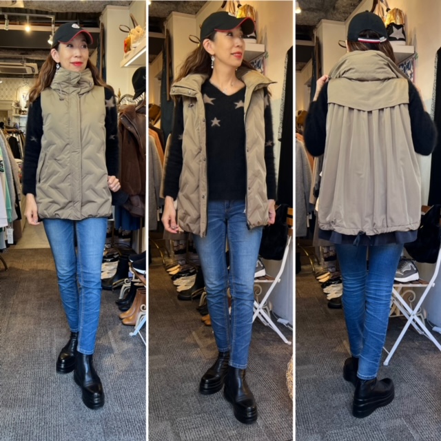 ダウンベスト💕😍 デザインダウンベストが到着しました💕 ダウン90%のハイクオリティな配合で、超軽量極暖😍となっております バックスタイルもかなーりお洒落💕 一点のみ入荷しております☆ 星のニット ¥25300 ラクーン 100% ダウンベスト ¥16500💕 2021年12月12日