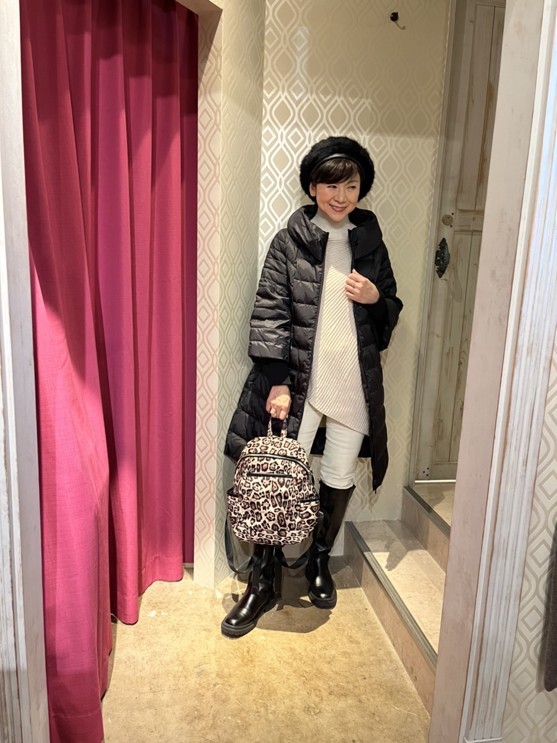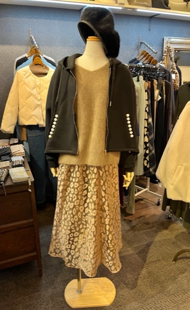 レオパードのチュールスカート💕 上品なレオパードプリントのチュールスカートをブラウンのニットとブラックのアウターでコーディネートしてみました💕 上品なモカブラウンのニットが、大人カジュアルを女らしく引き立ててくれる💕 一年頑張ったご褒美に、着心地の良い上質なニットを買って、これからの年末年始を乗り切って下さいねーーー ニット ¥20900 ラクーン100% ジャケット ¥16500 スカート ¥12100 ベレー帽 ¥5390 2021年12月15日