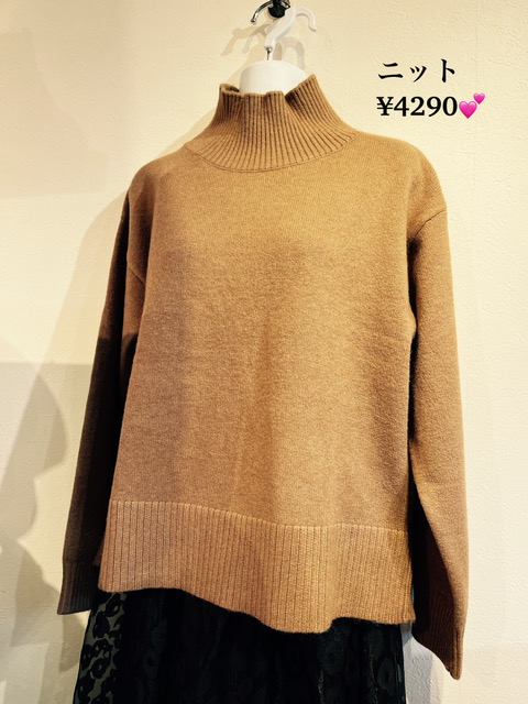 モックネックニット😍¥4290 適度な襟の立ち上がりと裾に向かってチョコっとAラインが綺麗なニットが再入荷しました💕 非ウール素材なのでチクチクしません⭐️ こちらのブラウンとベージュ、アイボリー、ブラックの展開となっております 人気アイテムですので、お早めにチェックくださいね😃🙌 いよいよニットがメーカーも品薄となっております 本日も沢山の商品が入荷致しますのでお楽しみにです💕 お洒落ニットをゲットするなら、年内が狙い目ですよん 2021年12月17日