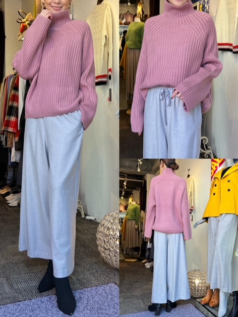 ニット¥11000 パンツ¥14300✨ 優しい印象のダスティーパンツのニットに、肌触りの良いワイドパンツのコーディネート✨✨ ニットはネックの立ち上がりがとても綺麗ですよ💕 パンツはウエストゴムで締め付けゼロです✨✨ ニット¥11000 パンツ¥14300 2021年12月23日
