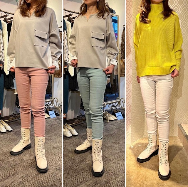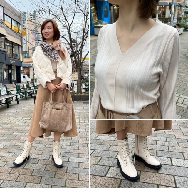 春のアイボリーコーデ💕 ウォッシャブルウールの上質ニットはスッキリとしたVネックで女度アップ💕💕💕 どんなコーデにも合わせやすい着丈で、スカートにインしても着膨れしません💕 これから大活躍のアイボリーのショートダウン コートとブーツで春らしいコーデに ニット、コート、スカート全てセールプライスとなっております お見逃しなく💕💕💕 ニット ¥8470 SALE ブーツ ¥9900 SALE 2022年1月16日