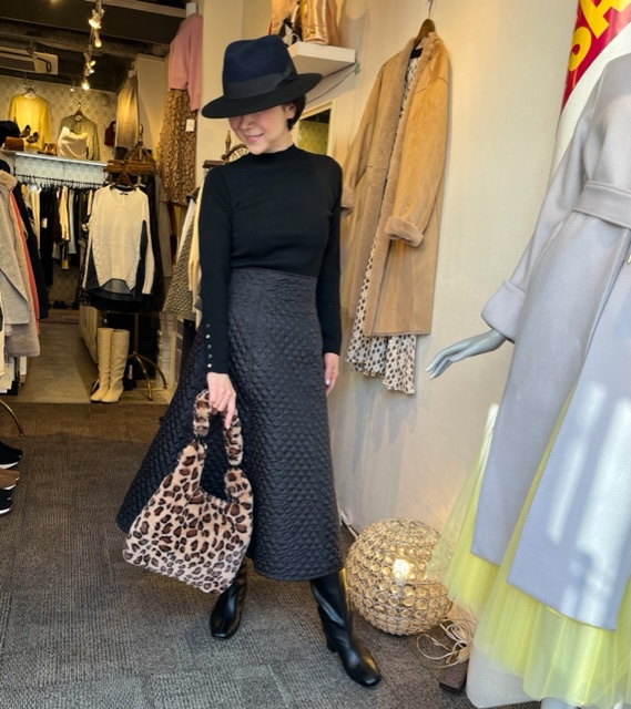 ブラック❎ブラックコーデ ブラック❎ブラックは、素材感を変えて楽しむと良いですよん シンプルなリブニットはスカートにインして、腰高に💕 無駄なデザインを無くしたシンプルなキルティングのスカートはバックゴムの仕様で、めちゃ履き心地が良いです スカートはシャンパンベージュ、ライトカーキ、ブラックの3カラーです ニット ¥5390 スカート ¥15180 ブーツ SALE ¥11880💕💕💕 ハット SALE ¥5313💕💕💕 バック ¥4290 2022年1月16日