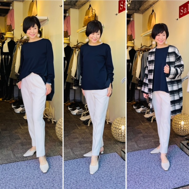 白❎ネイビー❎チェック 裏起毛の暖かい暖パンはトレーニングウェア並みの履きやすさ💕ですが、センタープレスなのでキチンと見え👌⭐️⭐️⭐️ ウォッシャブルのデザイントップスで快適なコーデはいかがでしょうか? チェックのコートなら無難になり過ぎ無い⭐️⭐️⭐️ パンツとトップスは30%オフ コートは何と50%オフでラスト一点です パンツのお色違いは、ブラックとベージュになります パンツ SALE ¥7546💕 トップス SALE ¥9933💕 2022年1月21日