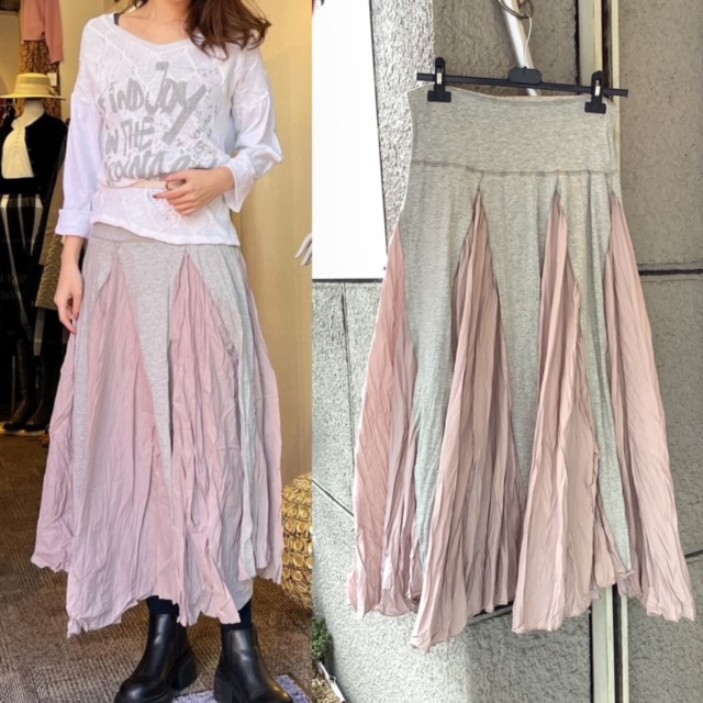 デザインフレアスカート💕再入荷しました 2カラーの生地を12枚に組み合わせたコットン素材のスカートが本日再入荷いたします💕 ウェストは伸縮のカットソー素材で着心地がとても良いスカートです👌 クリンクル加工は、お洗濯後に捻って置いておくことで、いつでも綺麗なクリンクルとなります💕 こちらのグレーと、ホワイト、ブラックもございます 一年中大活躍しますよぉ〜💕🙌 トップス 🇮🇹 ¥8690 スカート ¥9790 フリーサイズ 2022年1月25日