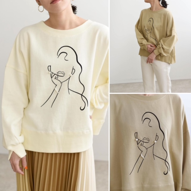 女の子デザイントップス💕¥6490 手書きの女の子とアクセサリー風にパールを縫い付けた、めちゃキュートな裏毛トップスです💕 前後差のあるシルエットでどんなボトムスともスッキリシルエットが楽しめます タイトスカートで合わせると、女らしく着こなせますよぉ〜 アイボリー、ベージュの2カラー デザイン性があってお得なプチプラは他社では見られない逸品です💕💕💕 しなやかな素材でカジュアル過ぎないのが嬉しい トップス ¥6490💕💕💕 2022年1月27日