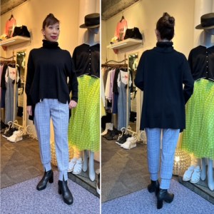 ジョガーパンツコーデ💕 新作のジョガーパンツは白地に黒の手書きチェックプリントがお洒落💕 センタースリットとライン入りですらっとしたシルエットが◎ 春まで着られるお得なブラックのチュニックニットを合わせて、気になるヒップラインもカバーしてくれますよぉ〜 ニット ¥6050💕 ジョガーパンツ ¥12100💕 2022年2月6日