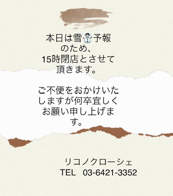 本日15時閉店のお知らせ 本日都内に雪の予報のため、早く閉店させて頂きます。皆様もどうぞお気をつけてお帰りくださいませ。 尚、雪の状況により、明日のオープンも少し遅れる可能性がございます。 また、ブログ、インスタに告知させて頂きますのでどうぞよろしくお願い申し上げます。 2022年2月10日