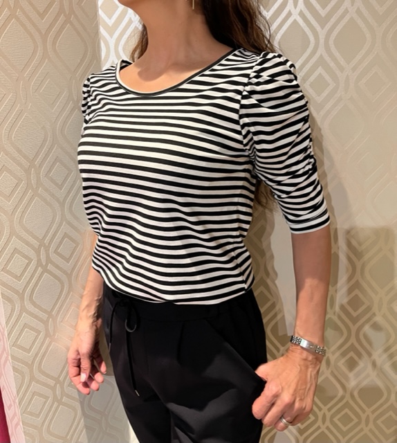 ボーダーカットソー💕¥5390 シンプルなネックラインと、ギャザーを寄せたパワーショルダー💕 スッキリしたシルエットで、どんなアイテムとも合わせやすい💕 お写真の白ベースの白❎黒と、黒ベースの黒❎白のカラーでございます コメントは受け付けていません。