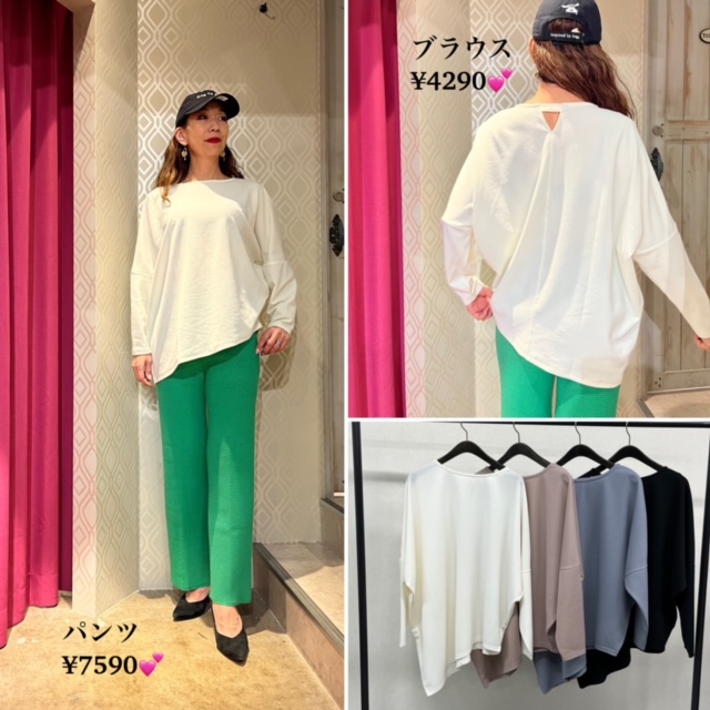 白シャツとグリーンパンツ💕 バンドカラーのバックシルエットシャツブラウス と鮮やかなカラーが目を惹く、グリーンのニットパンツのコーデはいかがでしょうか? 体のラインを拾いにくいワッフルっぽい編み地のニットパンツ💕とっても履きやすくて、プチプラ⭐️⭐️⭐️ お色違いはホワイトとグレーがございます ブラウス ¥8690💕 ニットパンツ ¥7590💕 2022年2月16日