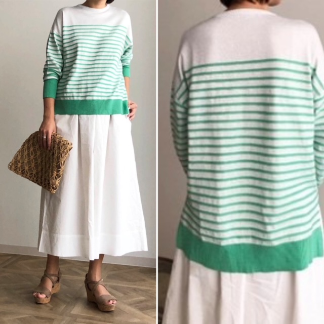 ボーダーニット💕明日入荷致します 白地にボーダーが素敵なコットンレーヨンのとろみニットが明日到着いたします💕 適度なサイズ感のスッキリしたシルエットで、カジュアル過ぎないのがGOOD💕 お色違いは、白にネイビーの配色となります ニット ¥8900 +TAX スカーチョ ¥9800+TAX 2022年3月15日