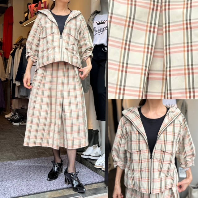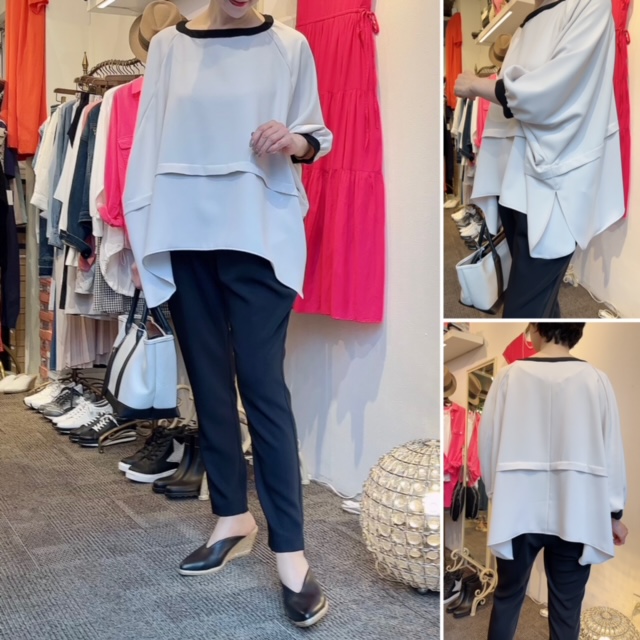 ベージュ❎ブラックのパイピングが素敵なシフォントップスと同素材のテーパードパンツのセットアップが到着しました💕💕💕