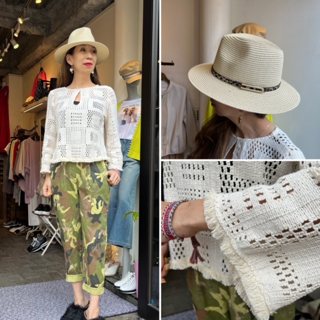 イタリアインポート🇮🇹 すかし編みがめちゃキュートなトップスと迷彩のパンツ💕 レオパードの飾りが入った中折れ帽子を被って、初夏の大人カジュアルの完成ですーー パンツはストレッチ素材のバックウエストがゴム仕様でとっても楽ちんパンツです。 おサイズはMサイズとなっております。 どちらも一点ものですーーー トップス ¥10800+TAX パンツ ¥13000+TAX 帽子 ¥8000+TAX 2022年4月1日
