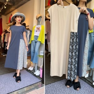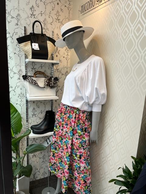 今から夏も着られるサラッとした七分袖のニットとイタリア🇮🇹インポートの花柄のスカートのコーデはいかがでしょうか?