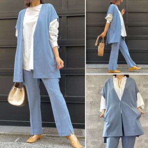 ジレ💕サックスブルー 🌸 春らしいサックスブルー のジレのコーデはいかがでしょうか? ポリエステル、ポリウレタン素材の軽い着心地💕夏にはノースリーブのアイテムに羽織って、さり気なくジャケット風に着られます💕 フロントに留フックあり ジレ ¥11000+TAX 2022年4月5日