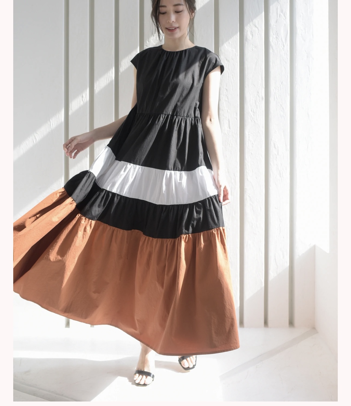 配色ティアードワンピース💕 ブラック❎キャメル❎ホワイトのラグジュアリーなワンピース💕💕💕 ボリュームたっぷりのスカートですが、ハイウエストの切り替えで、スタイルアップ⤴️効果あり。 比較的ゆったりした作りなので、Lサイズの方でも着用可能です 細身の方は、ウエストをキュッと締めても素敵です💕💕💕 一点のみの商品となります ワンピース ¥18000+TAX 2022年4月8日
