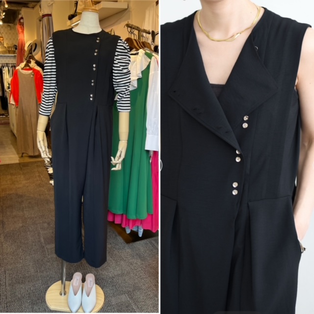 ボタンオールインワン¥11000+TAX 昨年も大人気だった釦デザインオールインワンが更に着やすくなって再入荷しました。 シンプルなストレートシルエットに、ゴールドボタンディティールがアクセントに 真夏も涼しい柔らかくさらっとした素材で着心地も抜群◎ 襟元は全て閉めた着方はもちろん、少し開けて着たりとアレンジして頂けます! 手洗いOK♀️ カットソー ¥4900+tax ミュール ¥15000+tax 2022年4月9日