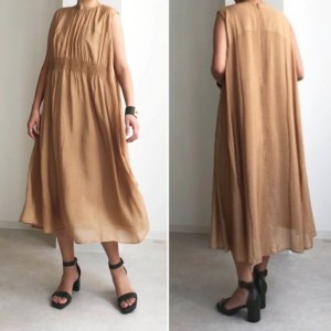 ウェストギャザーワンピース シルクのような光沢感のある生地で作られたデザインワンピースが到着しました 少しだけ裾に向かって広がるAラインで、体型を拾わずに、すらっとしたシルエットを実現 キャメル、ネイビー、グリーンの3カラーで到着しております ワンピース ¥12800+TAX レーヨン 75% ポリエステル 25% 2022年4月9日