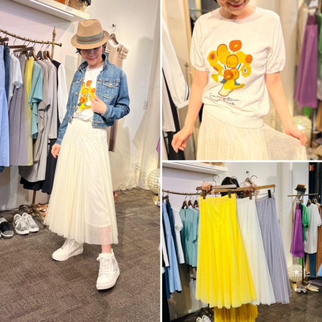 向日葵ニットとチュールスカート💕 ゴッホみたいな向日葵のモチーフが素敵なコットン素材の半袖ニット💕 とっても可愛くて、お洒落🥰 新作のチュールスカートは白、イエロー、グレー、ブラックの4カラーで到着しました ショート丈のデニムジャケットも相性良しです⭐️⭐️⭐️ ニット ¥11000+TAX チュールスカート ¥12000+TAX デニムジャケット ¥14800+TAX 星のスニーカー ¥9900+TAX 23.5〜25.0まで 白、シルバー、ブラックの3カラーです 2022年4月16日