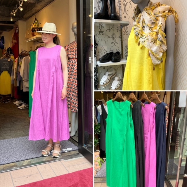 リネンワンピース💕 鮮やかなカラーのリネンワンピースは、ピンク、イエロー、グリーン、ネイビー、ブラック、レッドの6カラーで到着しました💕 上質なリネン素材は軽くしなやかで、着心地良く華やか💕 38.40の2サイズ ペチコート付き💕 ワンピース ¥14800+TAX 2022年4月18日