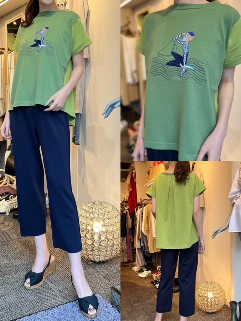 トップス¥15290✨ 可愛い女の子モチーフの 半袖カットソー😊🌿 前から見るとニットですが、後ろから見るとカットソーになっております☺️🌷 パンツは、ひとつ前のポストでご紹介しましたセットアップになります✨ トップス¥15290 2022年4月19日
