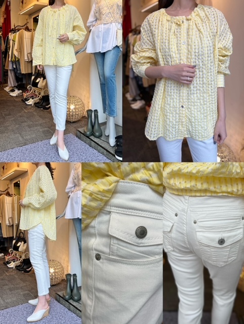 ブラウス¥10780 パンツ¥14080✨ 少しだけ透け感があって、独特の生地感がとても可愛いブラウス🍋 イエローのギンガムチェックがとっても爽やかです💕 後ろにかけて丈が長くなっているのでヒップも隠れます👌🏼 パンツは膝から裾にかけてシャープなテーパードラインになっています。履き心地抜群で、見た目はすっきりとてもキレイなデザインですよ❣️ ブラウス¥10780 パンツ¥14080 2022年4月19日