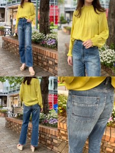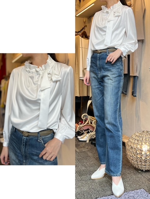 ブラウス¥13090 デニム¥15180✨ ビンテージサテンの肌触りの良いブラウス✨✨ 程よいシボ感と、襟元や袖元のデザインがポイント✨ おうちで手洗いしていただけます❣️ デニムは脚長効果抜群のストレートデニムです👖💕 ブラウス¥13090 デニム¥15180 2022年4月19日