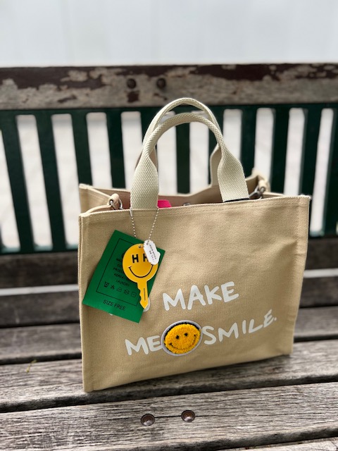 ニコちゃんトートバッグ💕 めちゃ可愛いチャームの付いたニコちゃんトートバッグが再入荷しました💕 GWのお出かけにぜひお一ついかがでしょうか? 斜めがけ出来るショルダー紐付き⭐️ ナチュラルとブラックの2カラーで再入荷です🎉 バック ¥6500+TAX 2022年4月26日