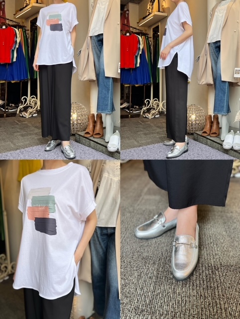 Tシャツ¥10780 パンツ¥12100✨ 絵画のようなデザインがとてもおしゃれなTシャツは、ビッグシルエットでゆったり着ていただけます✨ パンツはレーヨンポリエステルで、さらさらの肌触り💕 シルバーのローファーがコーデのポイントになっています❣️ Tシャツ¥10780 パンツ¥12100 ローファー¥8690 2022年5月7日