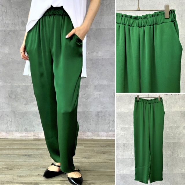 グリーンのとろみパンツ⭐️ テロンとした質感のサテンパンツはお仕事にもプライベートにも取り入れやすいアイテム💕 一点取り入れるだけで夏ムードがグッと高まります💕 ウェストのゴムが柔らかくて履き心地が良いのもGOOD😆 少し凹凸のある高級感のあるポリエステル素材で高見えします⭐️⭐️⭐️ Quality ポリエステル 100% Size(FREE) ウエスト 65-94cm ヒップ 104cm 股上F 29cm 股上B 42cm 股下 67m わたり 31cm 裾幅 19cm モデル160㎝ 2022年5月11日