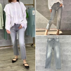 シルバーグレーの大人デニム 太ももから裾に向かって細めのストレートが脚のラインを綺麗に見せてくれるシルエット💕 裾のカットオフとサイドのスリットが抜け感をプラスしてくれ、短めの股下がパンプスからスニーカーまでスタイリングしやすい着丈となっております💕 Quality 綿 97% ポリウレタン 3% デニム ¥13000+TAX ブラウス ¥13800+TAX サイズ 24.25.26.27.28 2022年5月11日