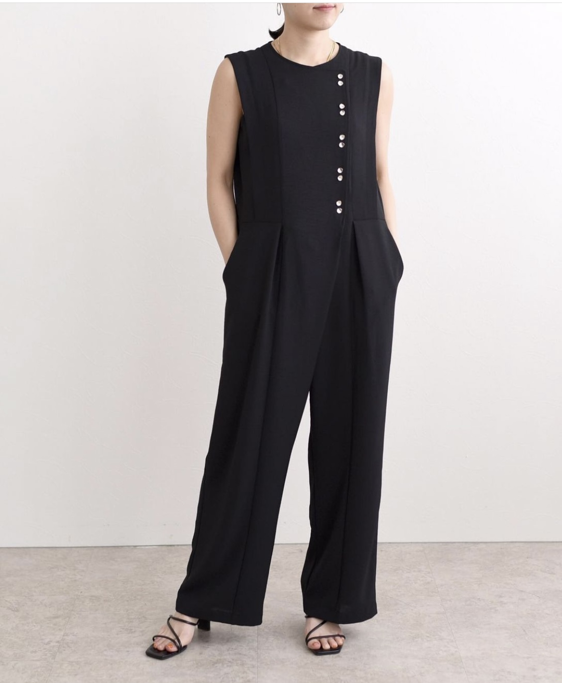 金ボタンのオールインワン 💕 胸元から縦に並んだ金ボタンがお洒落なアクセントになったオールインワン ワンピース💕 薄手のポリエステル素材で、サラサラの着心地💕 真夏もサラッと着ていただけます お腹やヒップのラインも拾わないからとっても楽ちんです 一着でお洒落が決まりますよぉ〜 もちろんホームクリーニングOK💕 オールインワン ¥11000+TAX💕 カラー ブラック 2022年5月13日