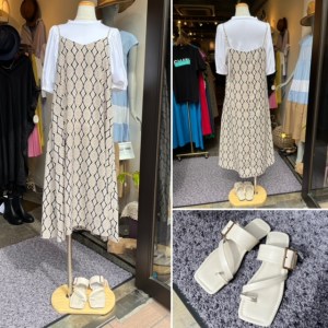 キャミワンピース ¥6900+TAX💕 モザイク柄のキャミソールワンピース💕 インナーにぴったりな袖パフのカットソーを合わせていかがでしょうか? めちゃプチプラアイテムなので、即売れの気配ーーー💕 明日もぜひ自由が丘にお出かけくださいませねーー。 掘り出し物が見つかりますよぉ〜 キャミワンピース ¥6900+TAX サンダル ¥5500+TAX 2022年5月15日