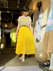 黄色いスカート💕 綺麗なカラースカートで初夏を始めませんか? 気持ちまで明るくしてくれる元気なイエローと、グレージュのプリントロゴT⭐️⭐️⭐️ 羽のように軽いコットンボイルスカートは一枚あるとヘビロテしますよぉ〜 イエロー、ピンク、ブラック、ライトグレー、ロイヤルブルー、グリーン、モカブラウンの7カラーで到着しております Tシャツもお色違いあり Tシャツ ¥7900+TAX💕 スカート ¥12000+TAX💕 2022年5月15日