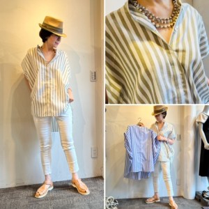 ストライプのシャツ💕 大人なイメージのストライプシャツは、ポリエステル✖️コットンのイージーケアが嬉しい💕 一枚着るだけで、女らしさの漂うシャツです エレガントなベージュと爽やかなサックスブルー の2カラー キチンと感もあるのでオフィスにもお薦めですよん シャツ ¥7900+TAX パンツ ¥11800+TAX 帽子 ¥4600+TAX 本革グルカサンダル ¥13000+TAX 2022年5月18日