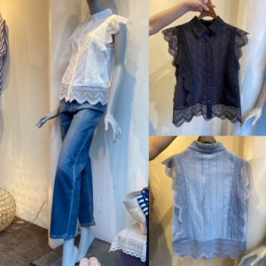 レースのトップス💕 初夏気分を盛り上げてくれる⭐️⭐️⭐️上質なレースをフロントとバックに贅沢に使ったシャツカラーのトップスが到着しました💕 甘めのフリルをキリッとしたシャツカラーが引き締めてくれる💕大変お洒落なトップスです 定番のホワイト、大人なブラック、爽やかなサックスブルー の3カラー💕 お得プライスをお見逃しなく😃 お家で手洗い可能です。シワになりにくいポリエステルのレースを使っております フリルトップス ¥11000+TAX💕 デニム ¥13800+TAX💕 2022年5月19日