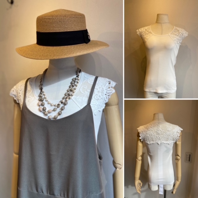 レースのタンクトップ💕¥4500+TAX 襟元と肩やお袖周りのストレッチレースが素敵なフレンチスリーブのトップスは、シャツやニットのインナーとして、またサロペットワンピのインナーとしても大活躍してくれるアイテムです💕アーム周りが比較的タイトなのが◎💕💕💕 白、黒、カーキ、の3カラーで到着しております。 グレー、ネイビー、白✖️黒のボーダーは来月の入荷待ちとなっております 2022年5月19日