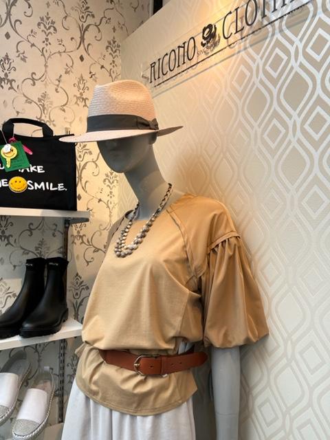 袖ボリュームトップス💕 カットソーの見頃にポリエステルシフォンのお袖をドッキングした、今年らしいトップスが到着しております💕 真夏もサラサラの着心地となるように、軽く上質な生地を使っております💕 少し長めのお袖も嬉しい🥰 トップス ¥9800+TAX💕 本革ベルト🇮🇹 ¥7900+TAX💕 2022年5月19日
