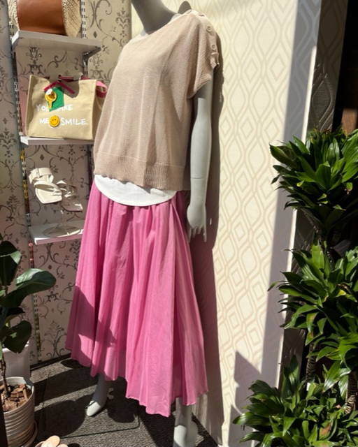 ベージュ✖️ピンク💕 大人のピンクコーデには、こんなスカートでいかがでしょうか? 春から秋まで使える、ちょっと落ち着いたピンクならどんなアイテムとも合わせやすい💕💕💕 コットンボイルの素材で高級感のあるカジュアルが楽しめます💕 トップスにはセットアップのサマーニットを合わせてみました💕 タンクトップとニットの2枚セットで¥5900+TAX🎉🎉🎉 これは買いですよん😆 トップス ¥5900+TAX💕 スカート ¥12000+TAX💕 2022年5月5日