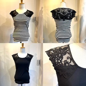 レースのトップス💕¥4900+TAX 肩にかかるフレンチスリーブが嬉しい💕 レーストップスが入荷しました 人気のボーダーの他、白、黒、カーキなどが入荷致しました💕 サロペットのインナーなどに合わせてもGOOD💕 2022年6月1日