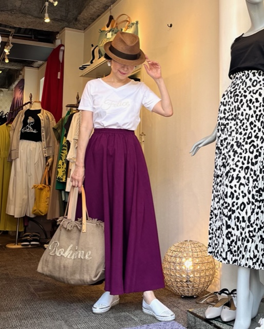 大人のフレアスカート💕 大人のマキシ丈フレアスカートが到着しました💕 シワになりにくいポリエステル素材で、ウェストはソフトな総ゴム仕様なので、長時間の移動などにもとっても楽ちんです💕 軽くて足にまとわりつかないから、ストレスフリー⭐️⭐️⭐️ 本当に履きやすいスカートです パープル、ロイヤルブルー、グリーンの3カラーで到着しました💕 スカート ¥14000+TAX Tシャツ ¥9900+TAX スリッポン ¥9800+TAX バック ¥9000+TAX 2022年6月1日