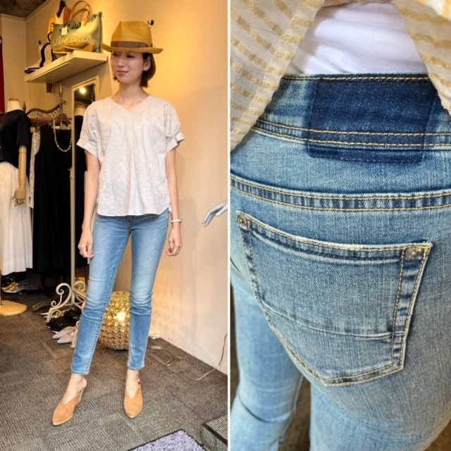 夏カラーデニム💕 夏に快適なサマーデニムが入荷しました💕 軽くしなやかな履き心地と爽やかなブリーチカラー💕 抜群のストレッチ感でお肉をキュッと引き締めてくれる⭐️⭐️⭐️ 23インチから26インチまで展開しております ブラウス ¥8900+TAX サンダル ¥15000+TAX 2022年6月3日