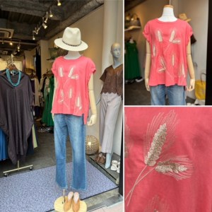 シャーベットオレンジのトップス🍊 ソフトなリネン生地に麦の穂を刺繍したデザイントップス💕 サラサラと肌に馴染むソフトリネンが気持ち良い⭐️⭐️⭐️ 綺麗なカラーもお薦めです ラスト一着です‼️ リネントップス ¥15900+TAX 2022年6月11日