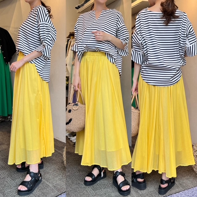 トップス¥12100 スカート¥13200 ✨ ボーダー×イエローの爽やかコーデ💛 トップスはお袖のデザインがとても可愛く、二の腕もカバーしてくれるのでおすすめです😊 トップス¥12100 スカート¥13200 バッグ¥9350 2022年6月11日